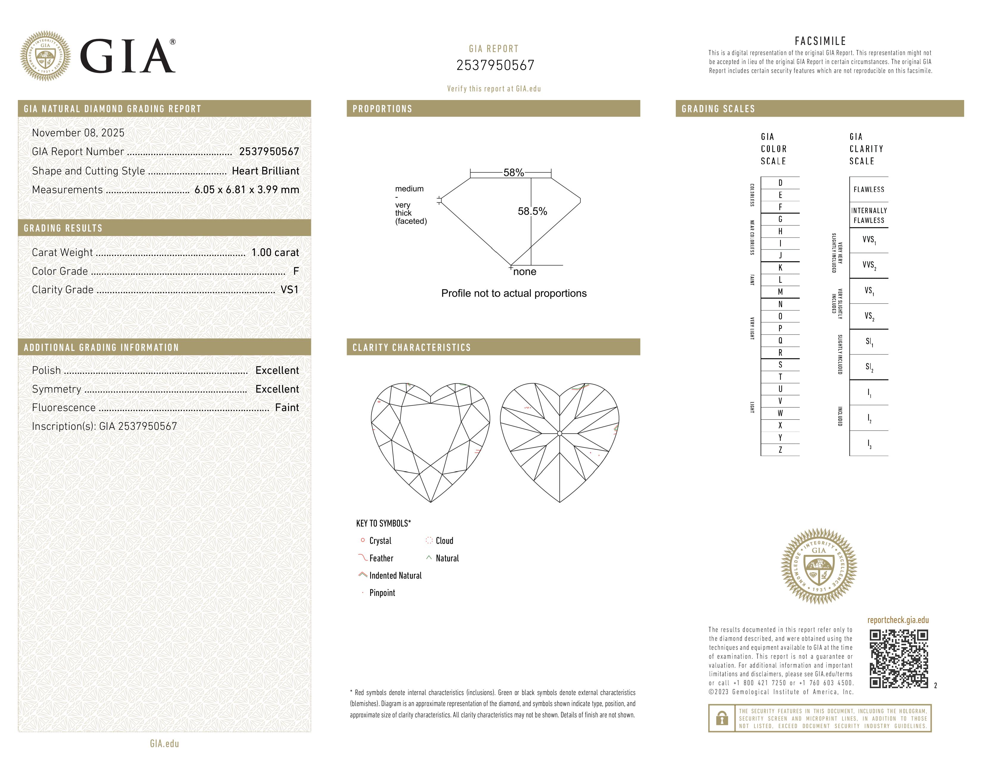 Роскошный бриллиант в 1.00 карат, формы сердце . Размер 6.05x6.81x3.99 полностью соответствует установленным стандартам для этой формы и массы камня. Оптимальная огранка подчеркивает и выделяет лучшие свойства этого бриллианта. Небольшая флюоресценция находится в рамках нормы. Фантастически выгодная цена. Хорошая ликвидность на вторичном рынке.
