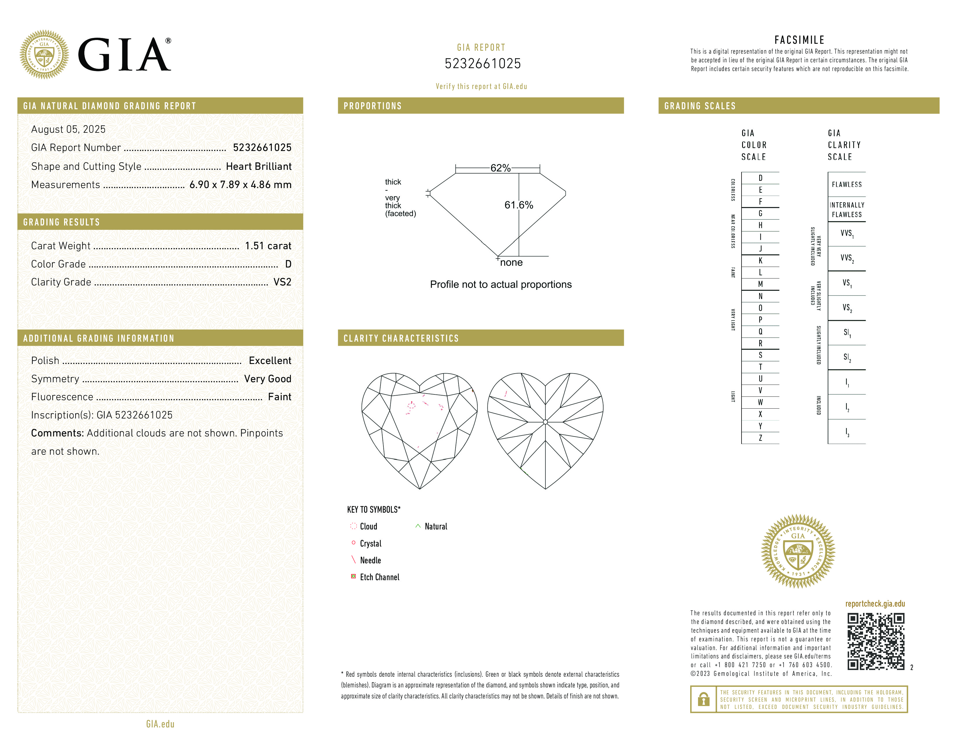 Роскошный бриллиант в 1.51 карат, формы сердце . Размер 6.9x7.89x4.86 полностью соответствует установленным стандартам для этой формы и массы камня. Небольшая флюоресценция находится в рамках нормы. Очень выгодная цена. Хорошая ликвидность на вторичном рынке.