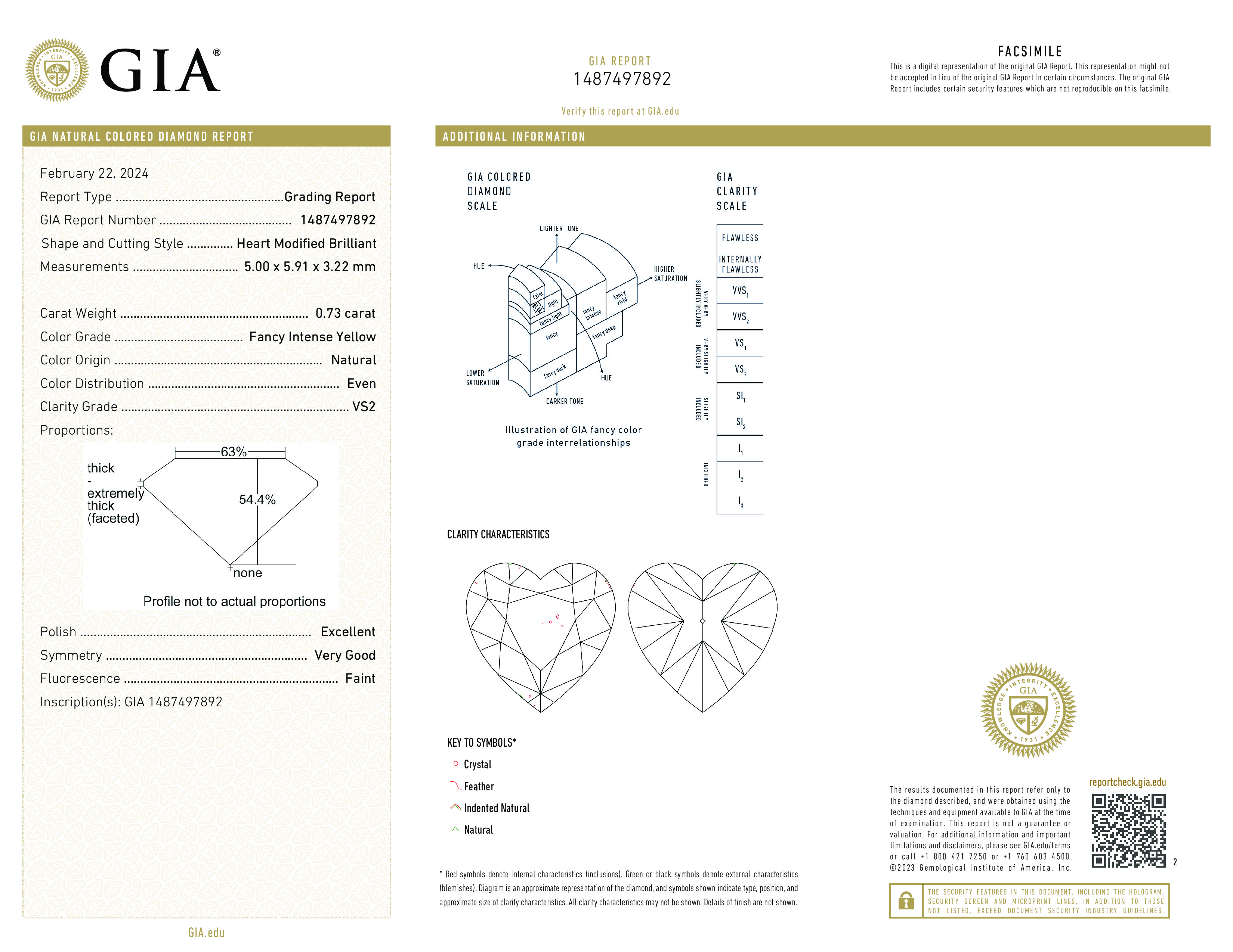 Цвет: Желтый (fancy intense yellow) Чистота: 5 (VS2) Фло.: Незначит. (Faint)