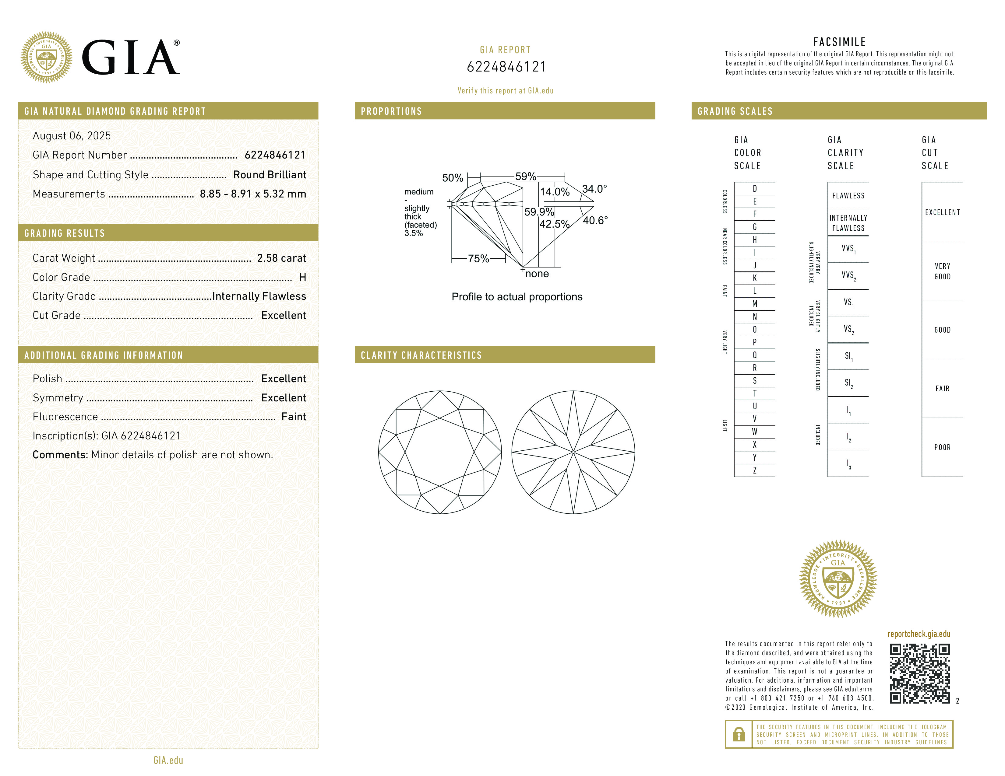 Фантастический бриллиант в 2.58 карат, формы круглый . Размер 8.85x8.91x5.32 полностью соответствует установленным стандартам для этой формы и массы камня. Оптимальная огранка подчеркивает и выделяет лучшие свойства этого бриллианта. Небольшая флюоресценция находится в рамках нормы. Очень выгодная цена. Хорошая ликвидность на вторичном рынке.