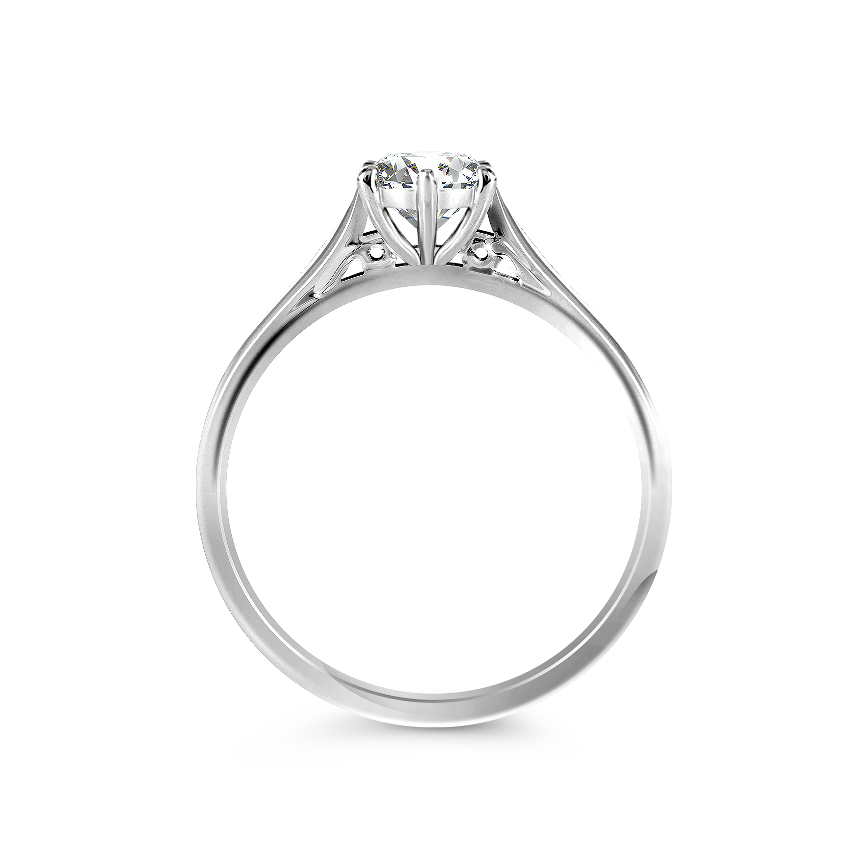 Ажурный узор дарит неповторимость и романтичность помолвочному кольцу с центральным бриллиантом яркой огранки "круг". Закрепка драгоценного камня подчеркивает совершенную классическую огранку и выгодно преподносит бриллиант.